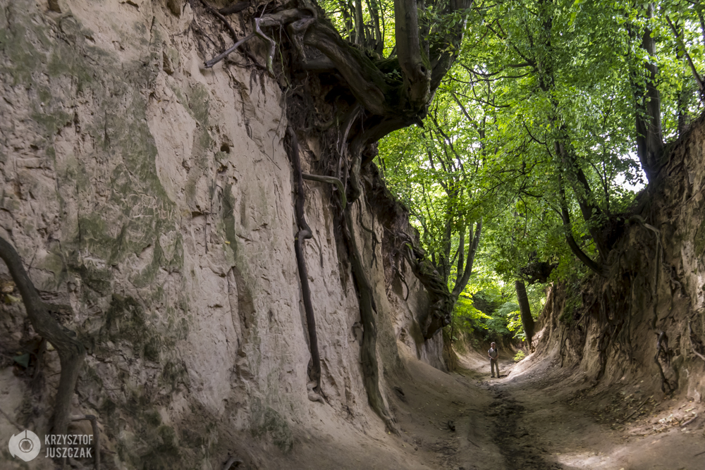 Spanko załatwione na ulicy Góry, czyli na wzgórzach miasta. Bardzo stroma ulica i po całym dniu naprawdę można mieć problem z wejściem. Po drodze mija się zamek i basztę, potem kilka zabytkowych domków, a idąc dalej jakiś kilometr dociera się do Korzeniowego Dołu. Podczas gorącego dnia to super miejsce. Od ziemi bije przyjemny chłód, a wysokie na kilka metrów, zarośnięte po obu stronach drzewami skarpy, dają miły cień. Widać że już jest mocno wydeptany i oblegany przez turystów, świadczą o tym napisy wyryte w piasku i glinie. Może dlatego, że było wcześnie rano i w środku tygodnia, nie spotkałem wielu turystów i dało się zrobić kilka fotek bez niepotrzebnych osób w tle. Nie radzę chodzić tutaj podczas ulew, bo może być niebezpiecznie. Widziałem jedno drzewo, które się przewróciło niedawno, pewnie podmyte strugami deszczu. Ciekawostka – sam wąwóz powstał pośrednio przez ingerencję ludzką.