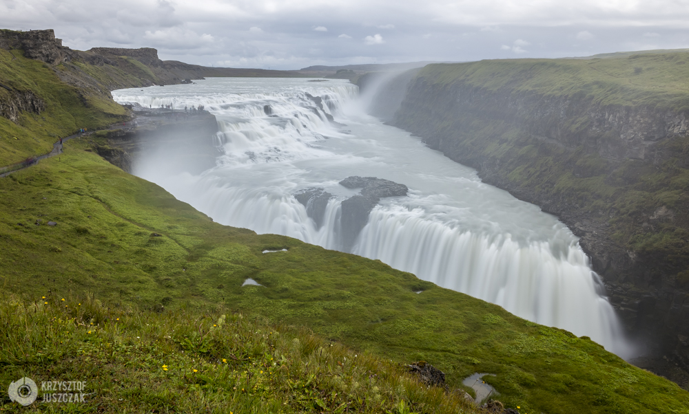 Wieczorem, niedaleko trasy, trochę przypadkowo znajdujemy jeszcze wodospad Faxi (nie widzieliśmy drogowskazów więc zalecam GPS). Uderza bardzo widowiskową, wodną mgiełką. Mniej znany to i mniej turystów. Za to na drugi dzień z rana podjeżdżamy na jeden z bardziej znanych wodospadów – Gullfoss. Pielgrzymki turystów ogromne. Mimo to i tak jest to jedna z obowiązkowych atrakcji na wyspie. Jego ogrom poraża i fascynuje. Dwie kaskady 11 i 21 m. Historia mówi o tym, że były plany budowy w tym miejscu elektrowni wodnej w 1920 r., jednak córka właściciela tej ziemi zagroziła w parlamencie, że jeśli do tego dojdzie to rzuci się z niego popełniając samobójstwo. Projekt wycofano, a my dzięki odważnej kobiecie możemy się cieszyć jego majestatem.